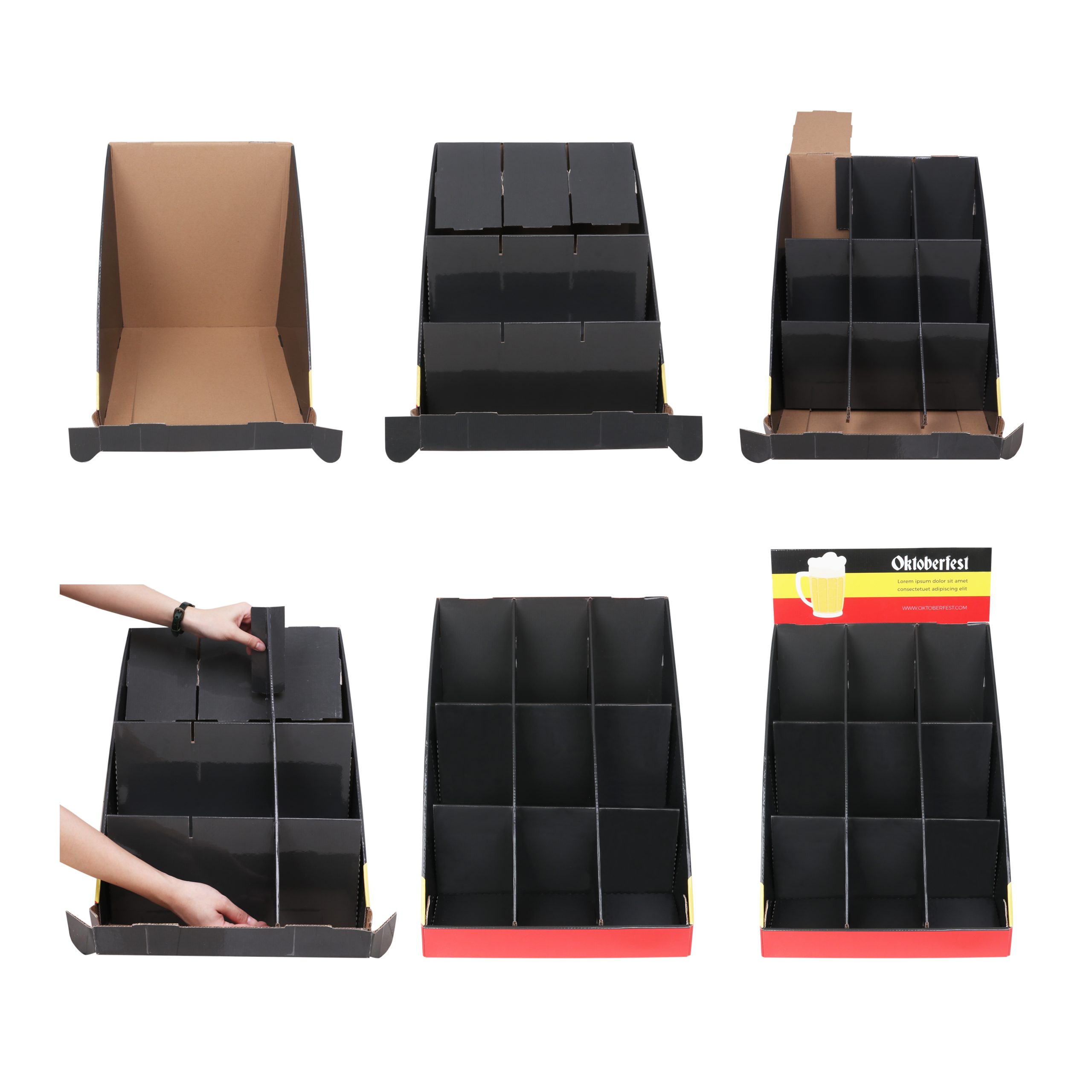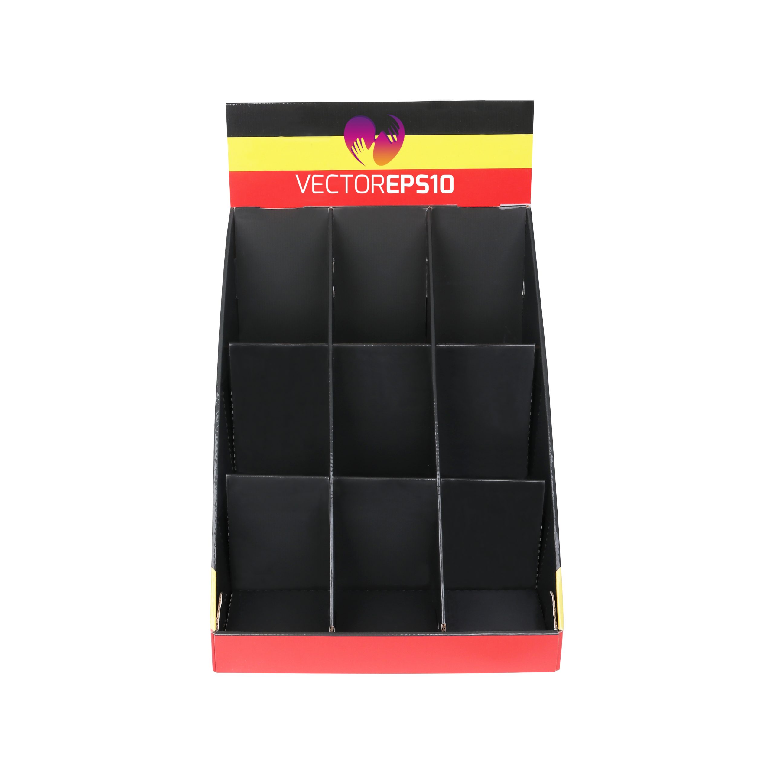 9 Pockets Counter Display is an ideal way to roll out your products in a cost-effective way. Our lightweight and environmentally friendly cardboard counter can be fully customized design to hold any products you want. Great printing area allows you to stand out your branding maximumly in the shows, exhibitions or supermarkets. In additions, this item is 100% made of recycled and wasted paper, ideal for environment protection. Glossy and matte lamination surface treatment is available to choose from.