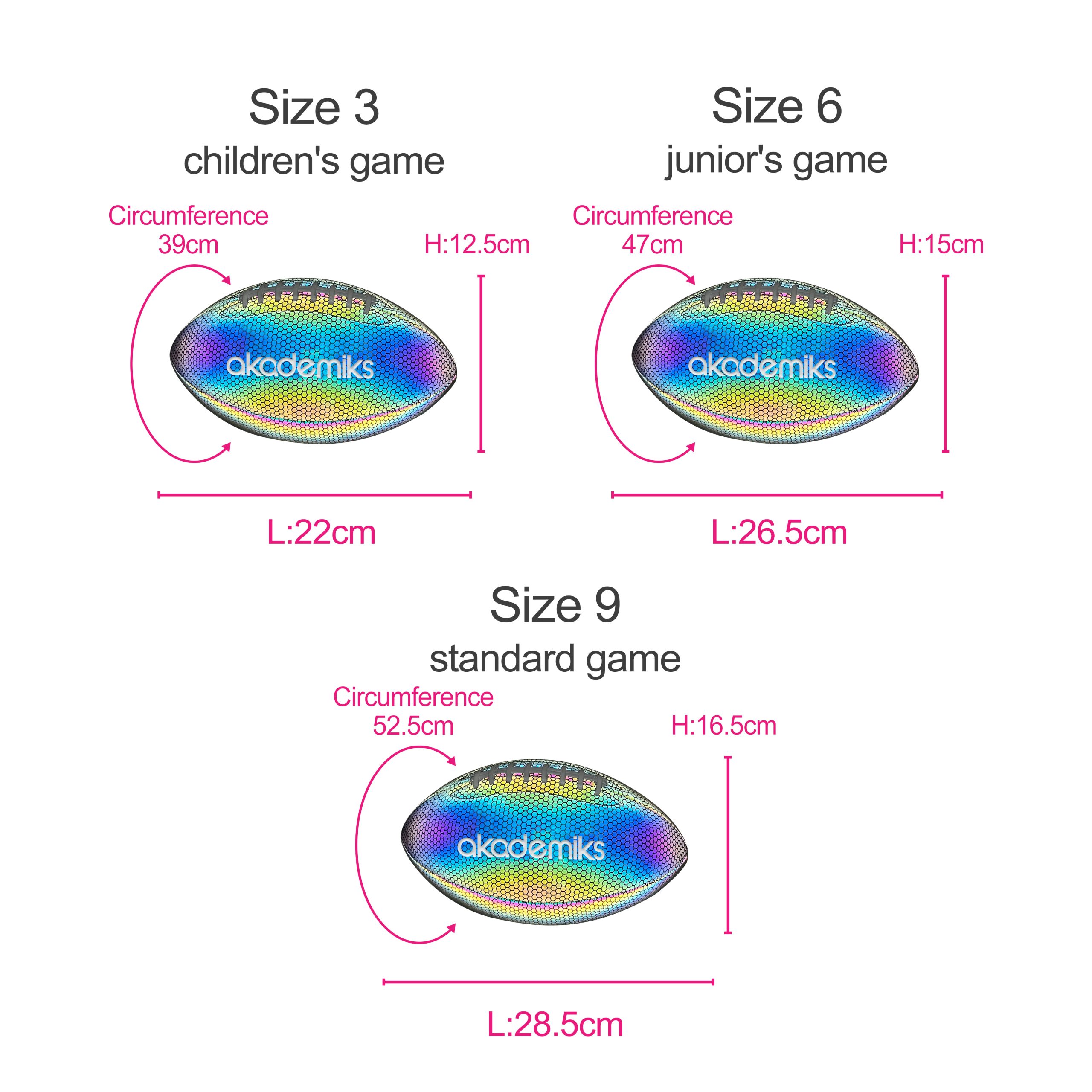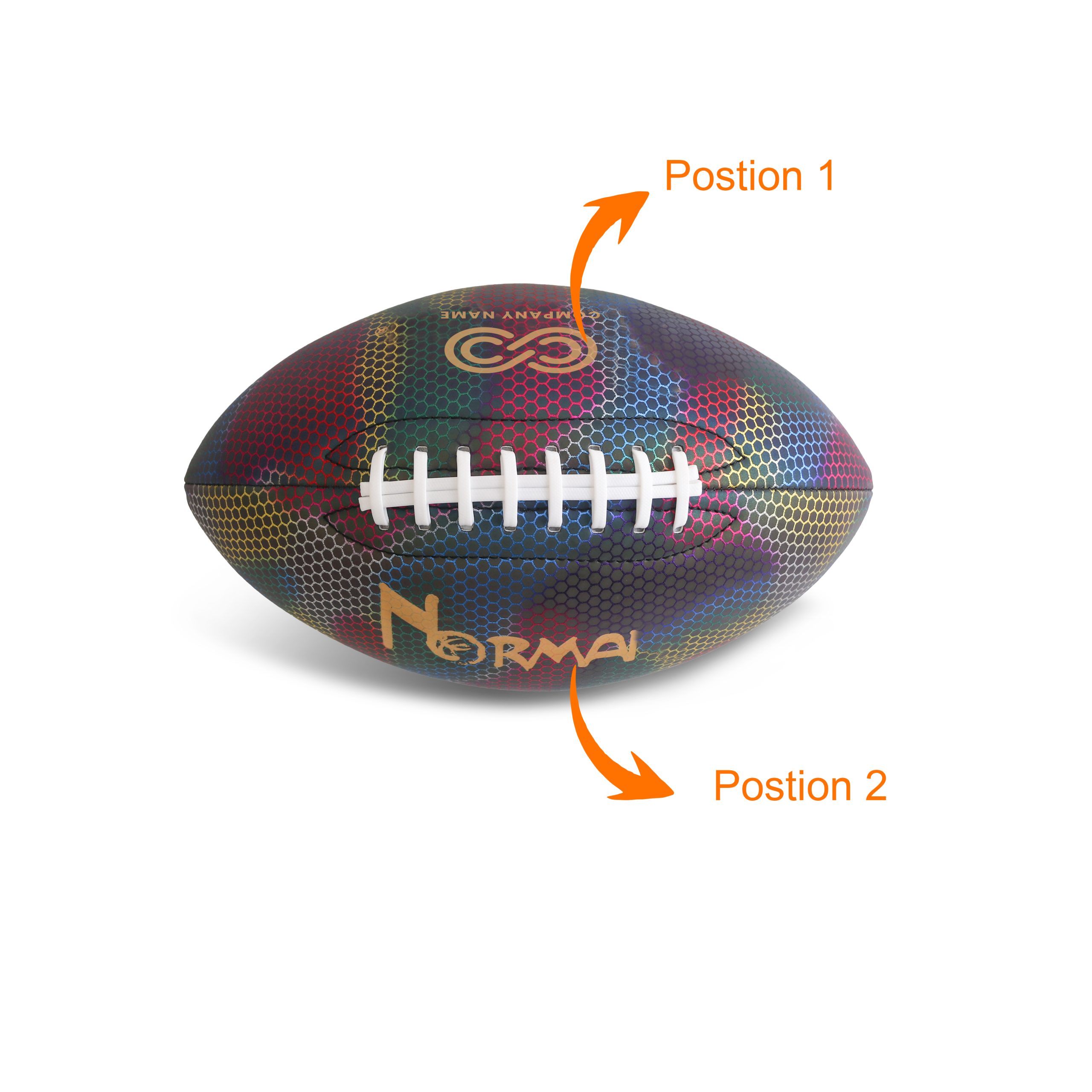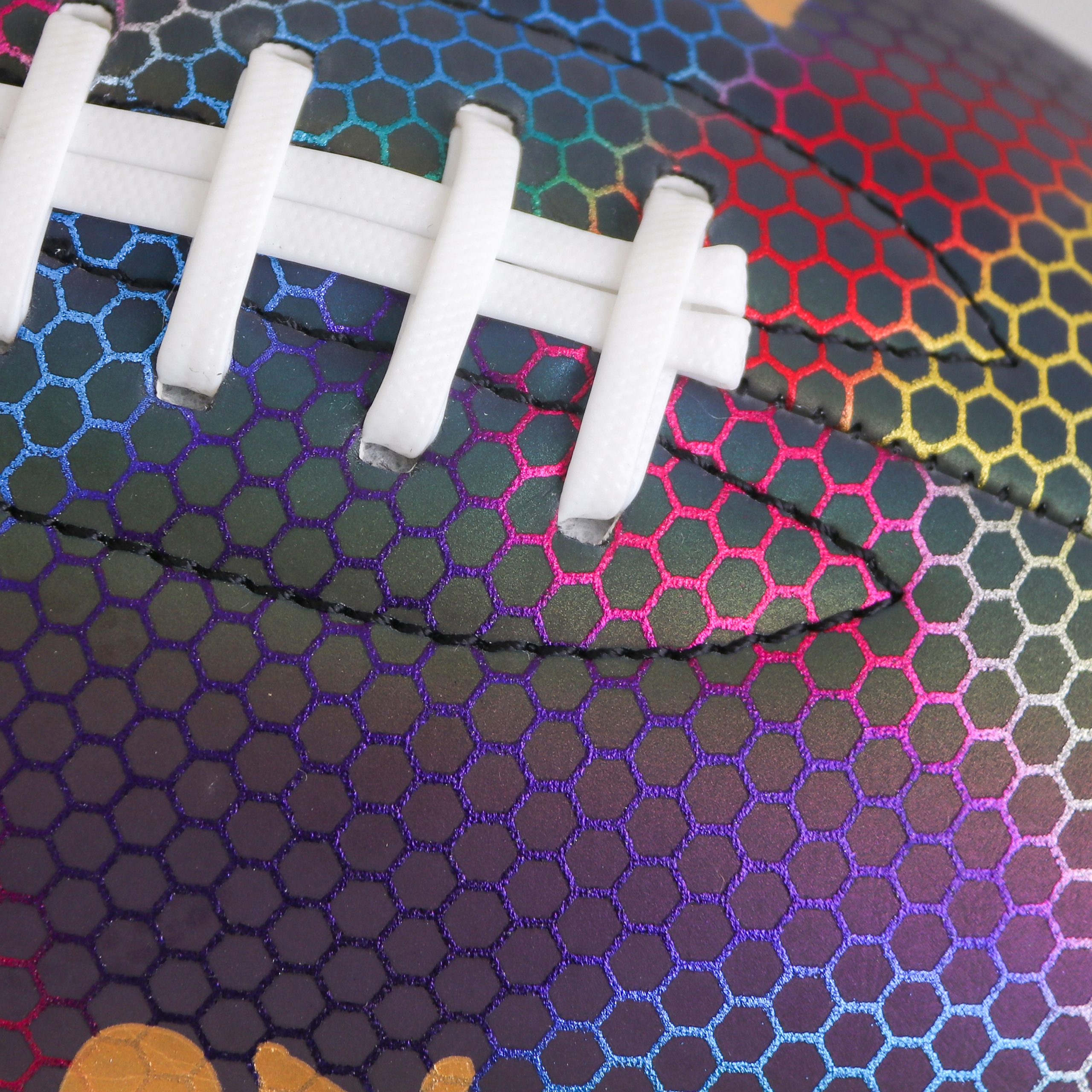 Our Holographic Glowing American Footballs are sure to make an impression! They are manufactured from reflective PU material, which appears holographic or glows in photos or videos when the camera flash is on. Can be fully branded with your logo to stand out during the game. Great for leisure activities, school carnivals, or anything sports related.