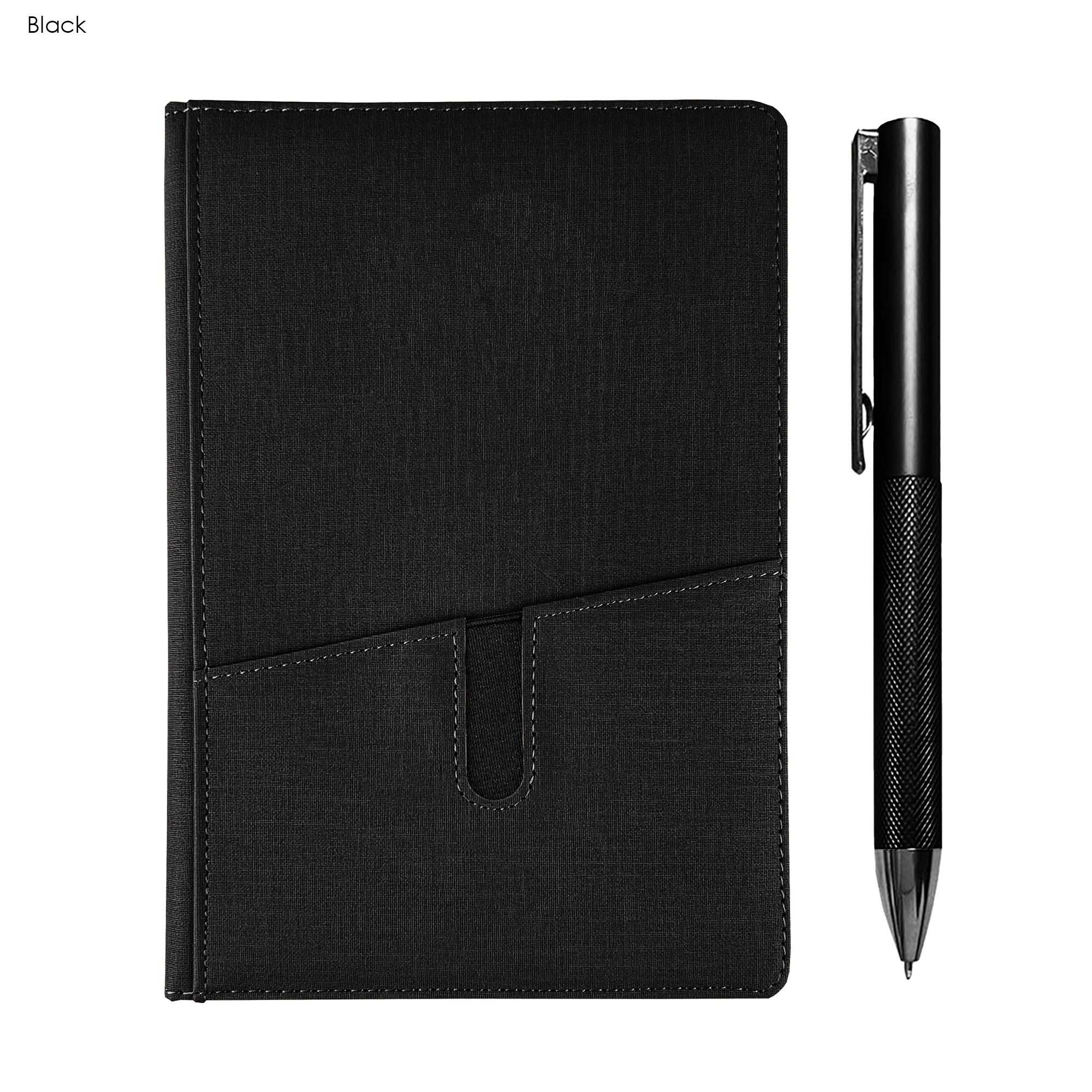 The stylish A5 Isaly Notebook features a high quality cotton style hard PU cover with a front pocket and 160 pages of lined paper. Paired with a sleek metal pen with a Parker Type German refill, both are presented in a durable black cardboard gift box, perfect for corporate gifting.