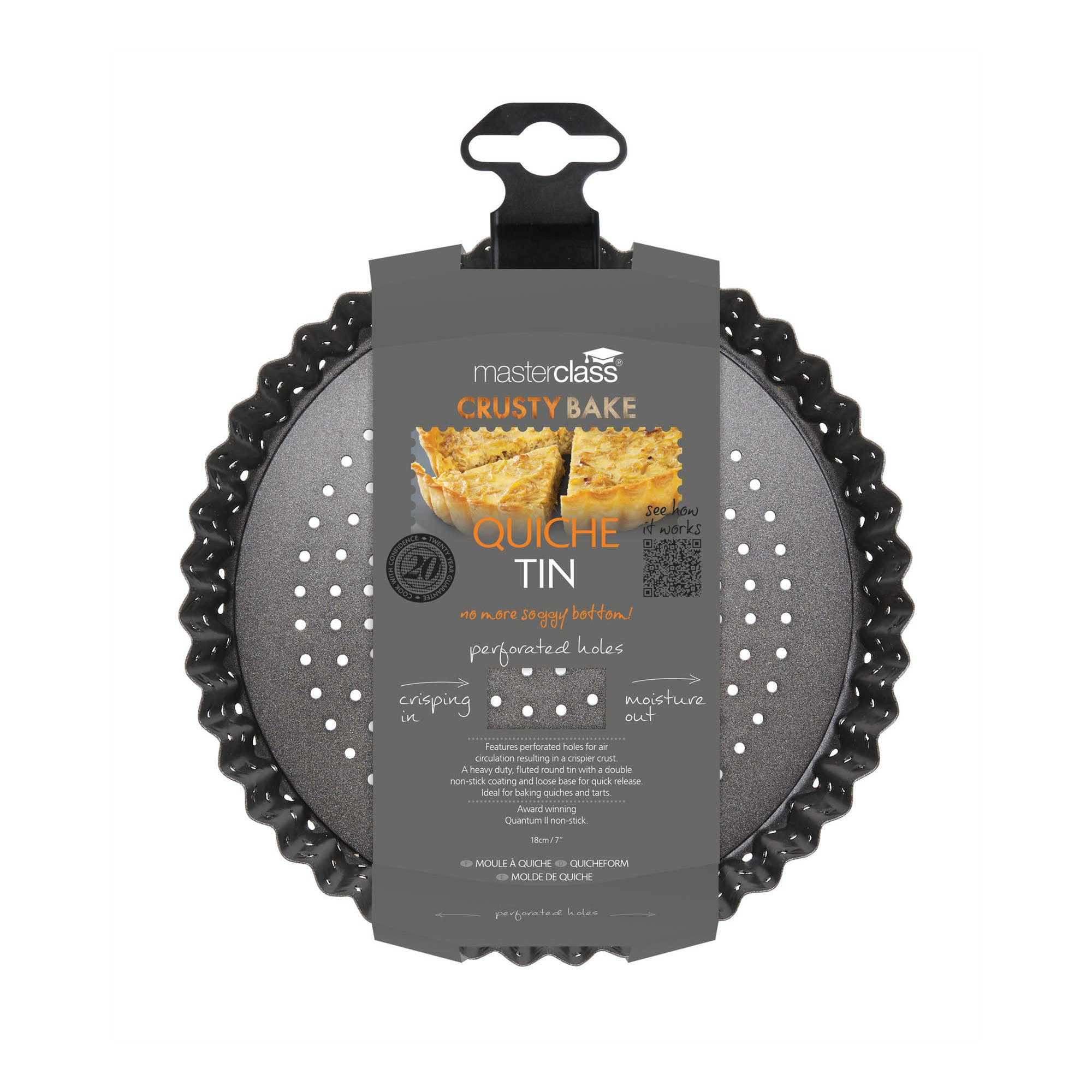 Make delicious quiches, flans and tarts with this non-stick, loose base, fluted round quiche tin. The perforated holes along the base and sides ensure the air circulates freely during the cooking process and you can create fruit flans and savoury quiches with the perfect golden-brown, crisp crust.