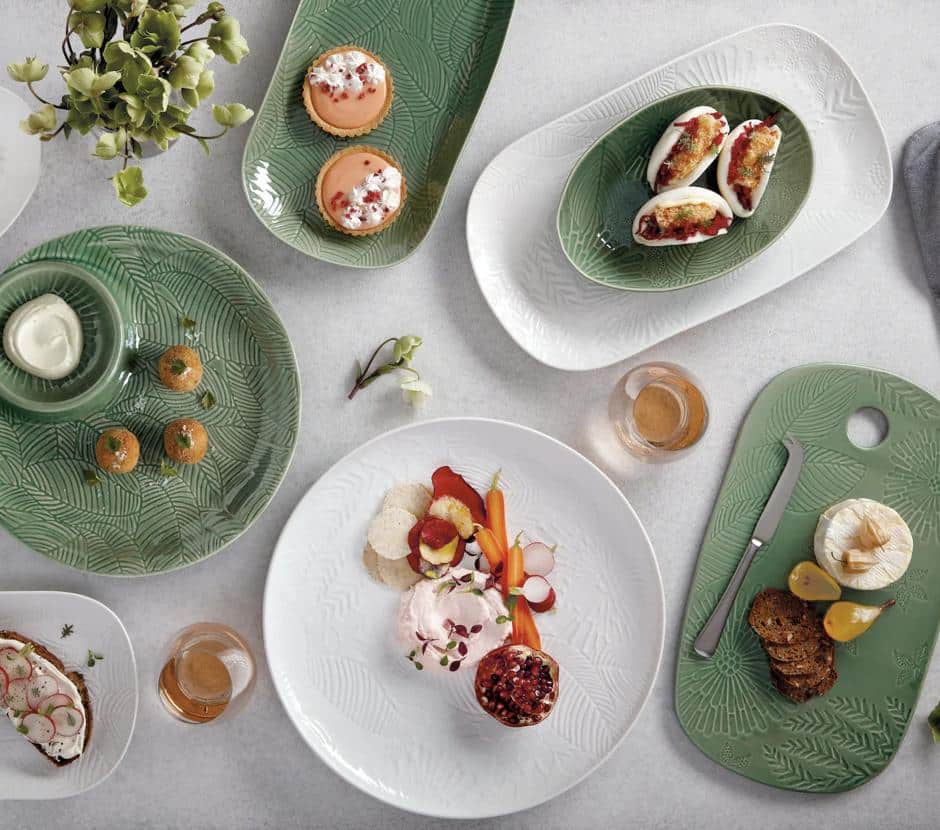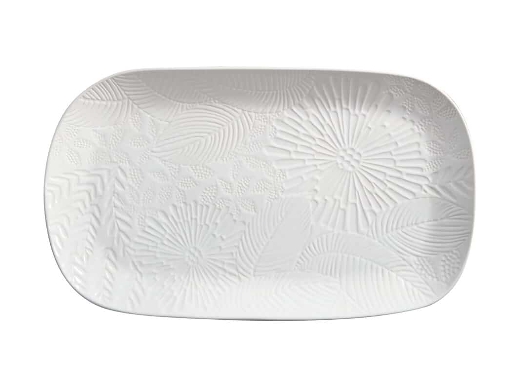 The wide expanse of white stoneware showcases its embossed foliage, lending textural and visual appeal to your table.