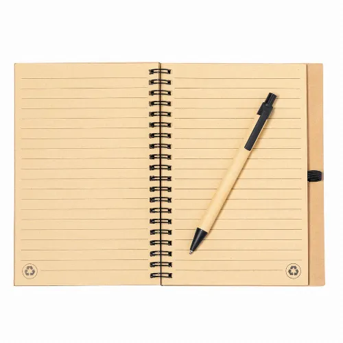 The ring notebook stands out for its rigid natural cork covers, with 80 inner sheets in single-stripe layout. Includes push-button mechanism ball pen with barrel made of recycled cardboard and blue ink. Presented in a recycled paper bag.Made with plant-based elements to promote the use of natural raw materials and reduce polluting emissions.