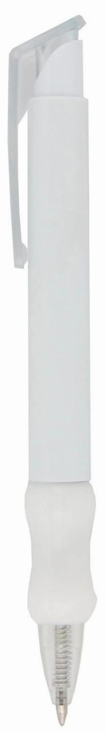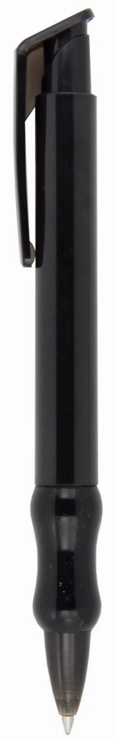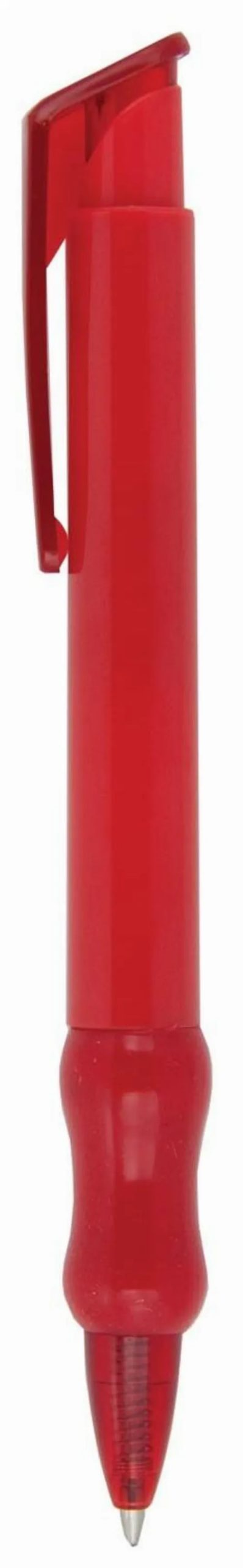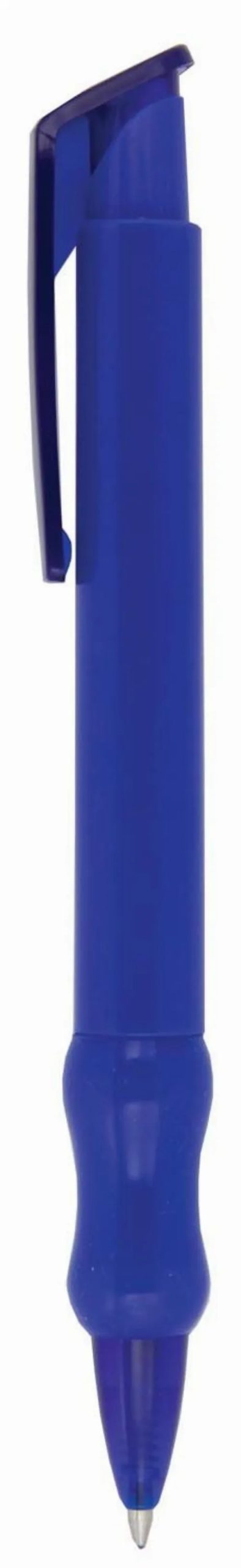 Push action plastic pen with curved grip and translucent trim.