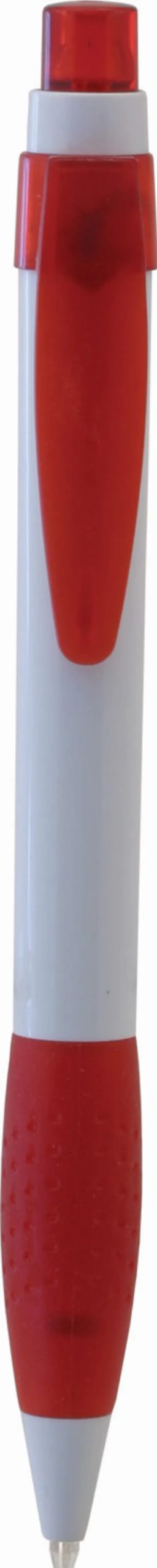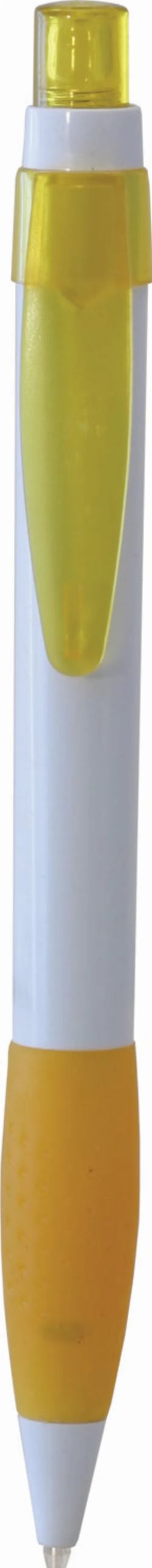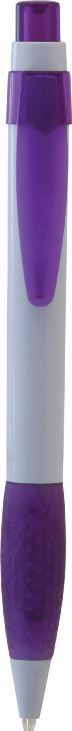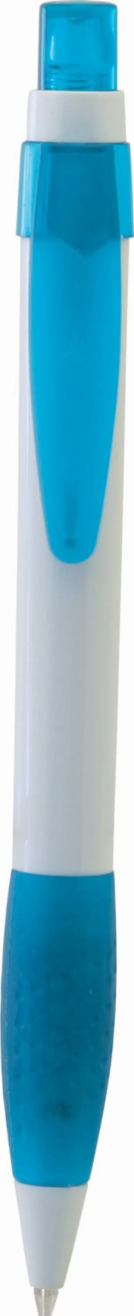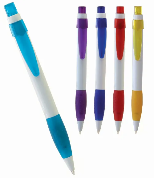 Contemporary design push action plastic pen with white barrel, contrasting coloured translucent clip and matching rubber grip. Parker style black refill.