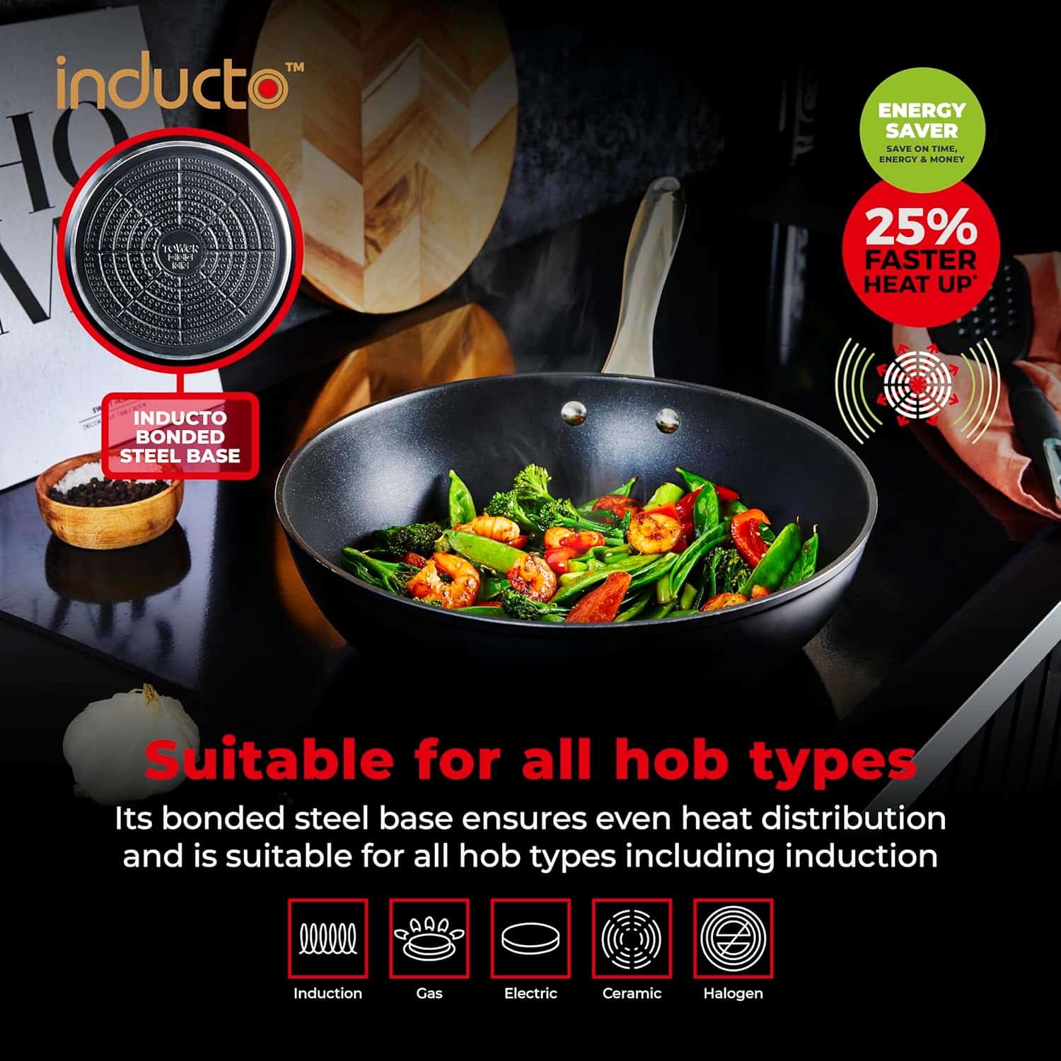 It is suitable for all hobs, including induction, whilst the Inducto™ base heats up 25% faster than standard induction bases.
